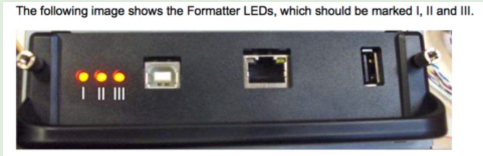 The formatter board has either a network cable or USB cable plugged into it. Next to the connector there are 3 LEDS on the formatter board. They are labeled I, II, III. They will either be solid or flashing. You need to determine what the sequence of the three LEDS are in order to decode the error. Here are the most common errors.